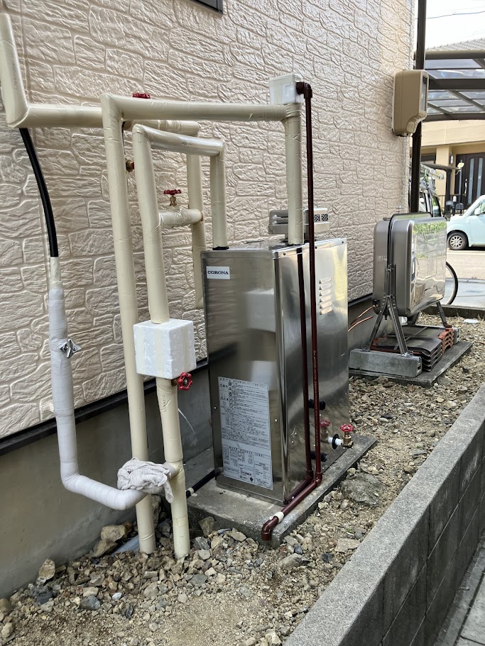 確認したところ、コロナ製の石油給湯器に太陽熱温水器が接続されている状態でした